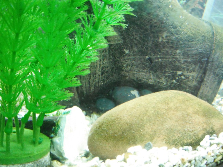 Once the eggs started to hatch, the hatchlings were moved into a shallow burrow that the parents had dug in the substrate behind the rock. There, they wiggled and grew for around two days. Then, the parents moved the wriggly babies onto the inside wall of the pipe statue, where they were guarded by the parents (who had to keep moving the babies back inside the pipe when they wriggled too close to the edge). It was very cute to watch!